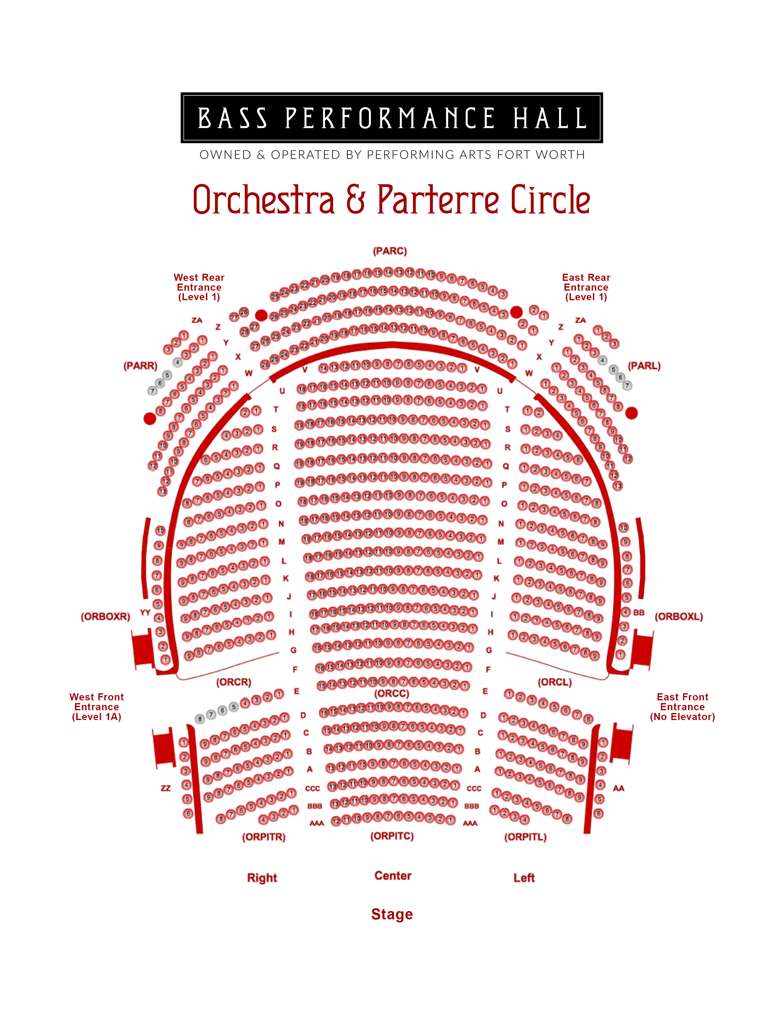 Behind the Orchestra is the Parterre Circle, Rows W-ZA. Situated below the Box Tier, the Parterre mainly features fixed seating with some freestanding chairs, typically reserved for those requiring Accessible seating.There are two main entrances to the Parterre Circle in the center of the Grand Lobby (street level). Stairs may be required for certain rows. No stairs are required for Accessible seating.