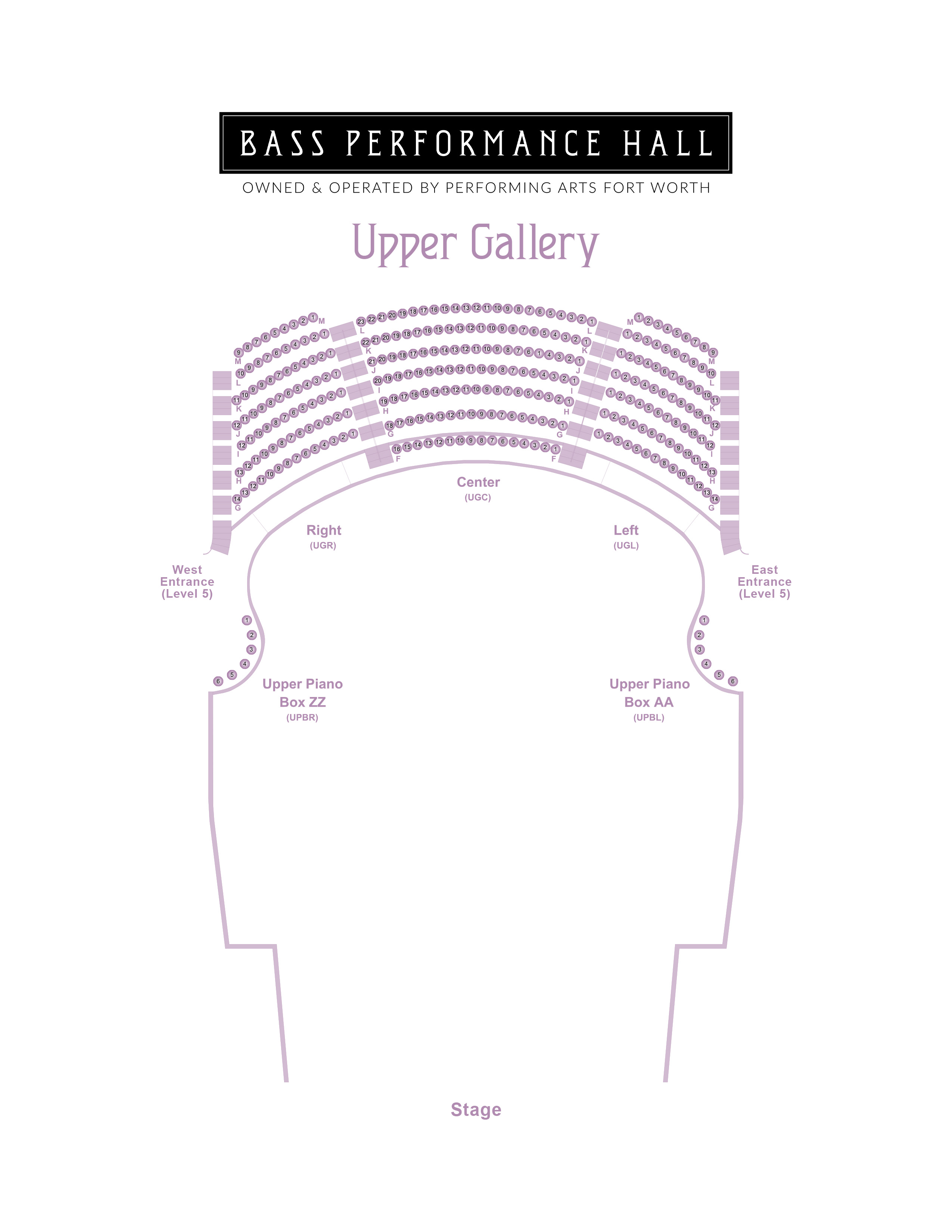 The fifth floor of the Founders Concert Theater is the Upper Gallery. Seating is primarily divided by aisles into three main sections: Upper Gallery Left, Center and Right. Seating in rows F-M consists of fixed chairs with folding seats. Row F is only in Upper Gallery Center. Row M is only in Upper Gallery Left and Right. Rows G-M require stairs to access. Leg room and chair width vary by row and seat.