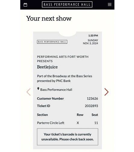 The recipient will receive an email from [email protected] with a link that will display the ticket barcode(s) and seat location. The barcode(s) can then be scanned directly from the recipient’s mobile device upon entry to Bass Performance Hall.