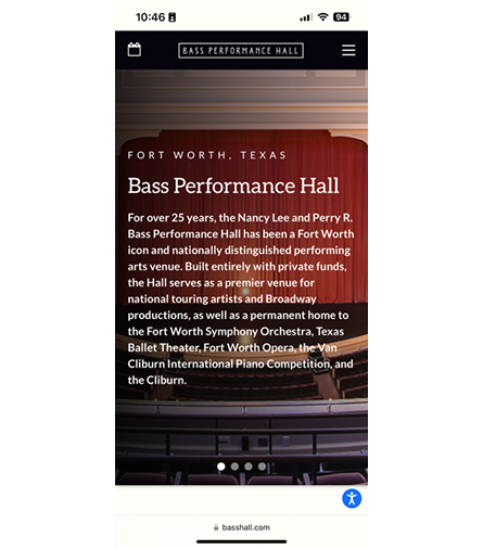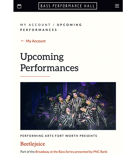 All tickets to Performing Arts Fort Worth shows are 100% digital. Any ticket you purchase from Performing Arts Fort Worth will be available and up-to-date in your account. You can log in both on a desktop and a smartphone. The steps below will show you how to log in on your smartphone to access your mobile tickets before you enter Bass Hall.
